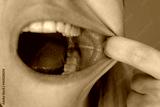 Close-up of a young woman revealing bite marks on the inside of her cheek, caused by stress and misalignment. A raw and intimate portrayal of hidden discomfort