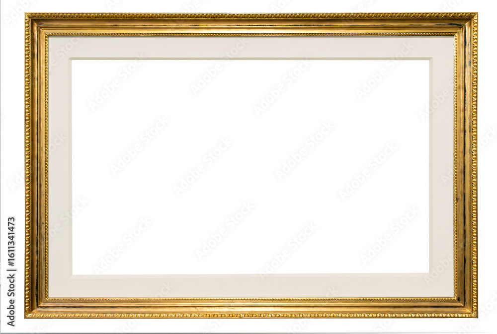 Artistic gilded antique picture frame with passepartout on transparent background.