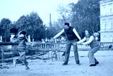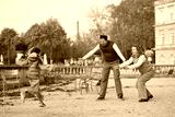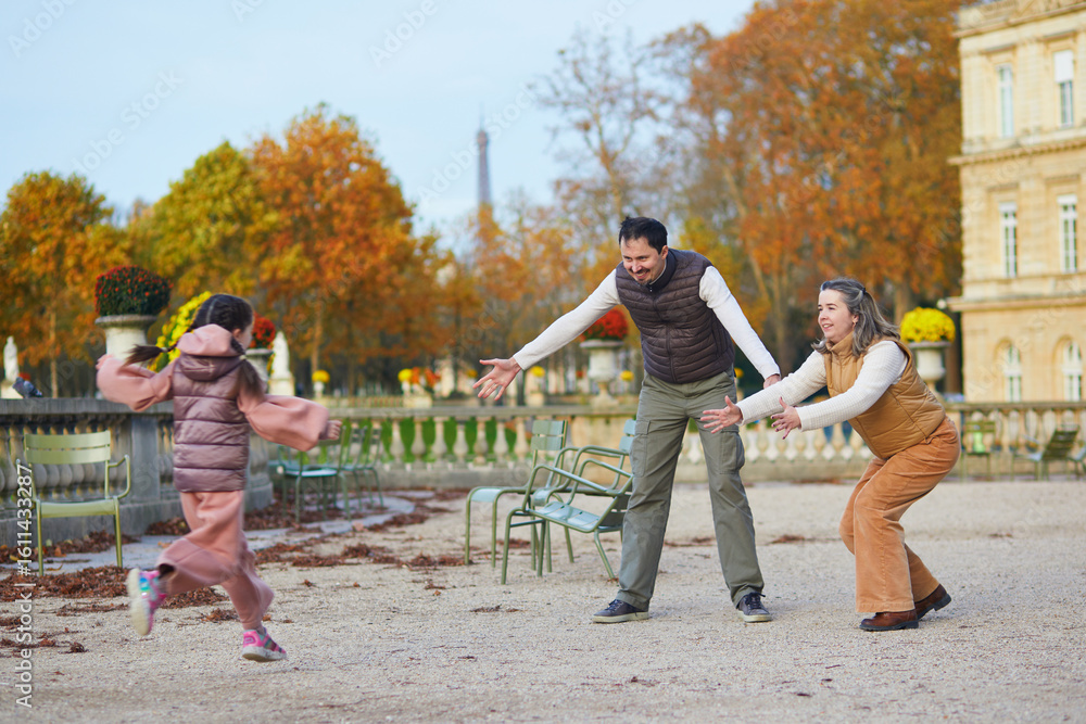 Happy family of three, father, mother and daughter enjoying family time together in Luxembourg garden of Paris, France.