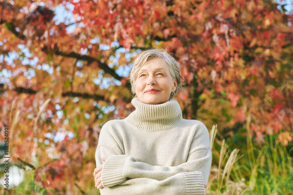 Outdoor portrait of happy mature 55 - 60 year old woman in autumn park, wearing beige pullover. Active and healthy lifestyle