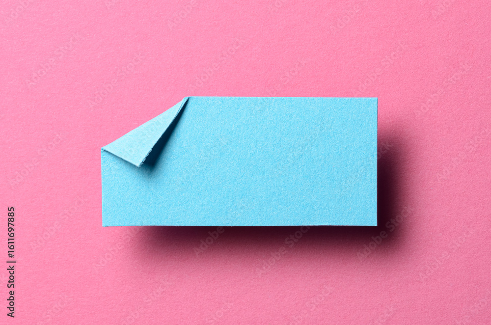 Blue blank paper note cardboard with folded corner dog-ear earmark, shadow and copy space for text on pink background