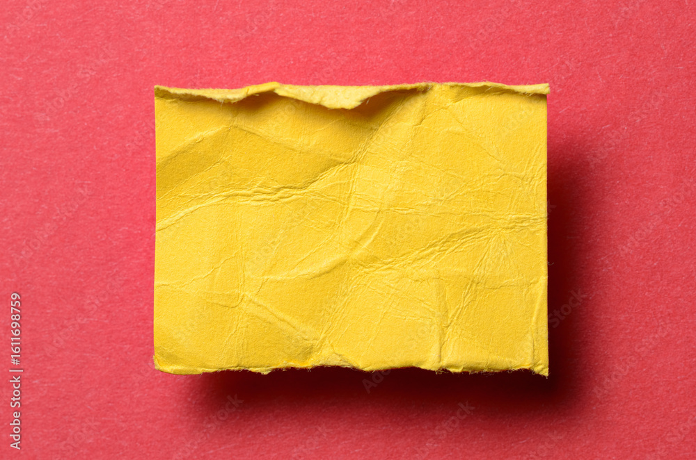 One single yellow torn ripped wrinkled crumpled blank paper note with drop shadow, folded edge and copy space for text on background