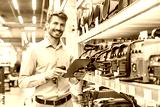 Portrait of happy man using digital tablet in hardware store