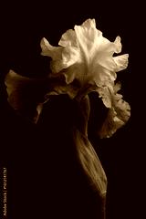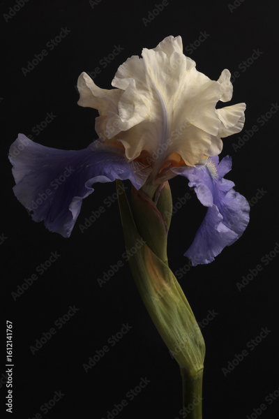 Close-up selective soft focus cream beige, violet Iris Flower on black. Macro natural abstract background.
