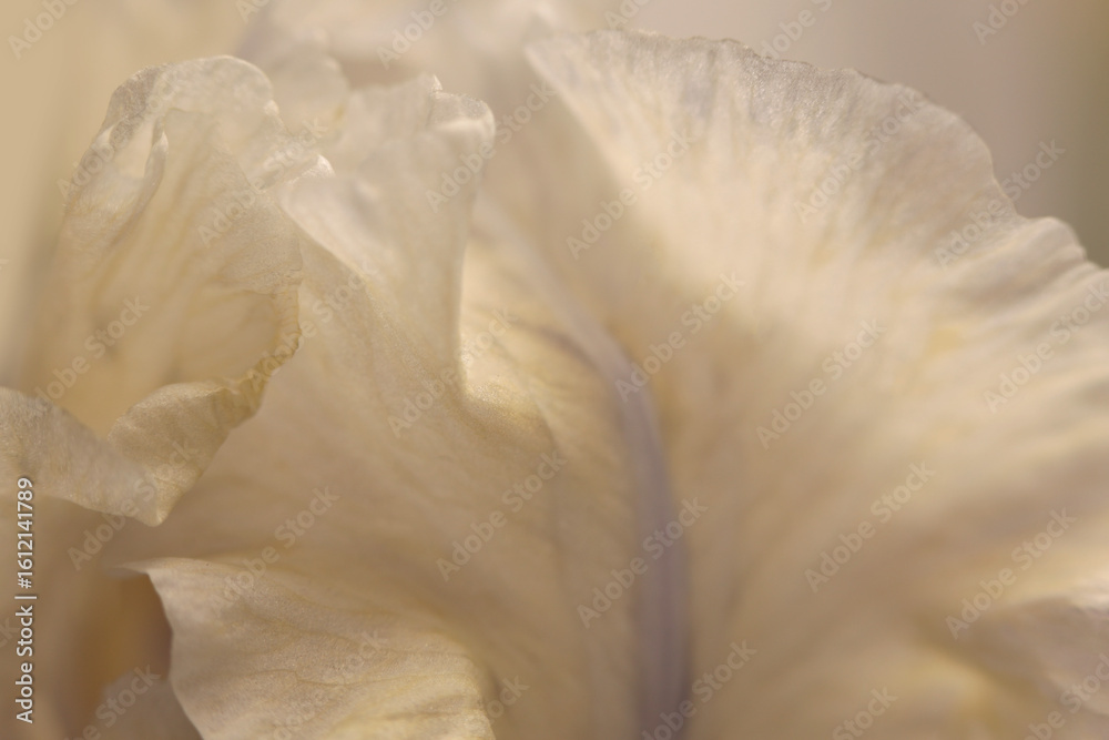Smoke Close-up selective soft focus cream beige, white Iris Flower petal, pistil; stamen. Macro natural abstract fog blur background.