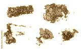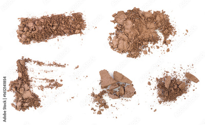 Crumble and crushe violet eyeshadows, powder. Broken cosmetics on white background.