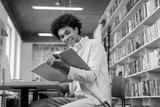 Happy black student guy studying in library, writing notes while reading book, preparing for lecture indoors, free space