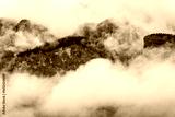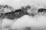 Dramatic landscape of Cascade Mountain in Banff covered by thick clouds and fog