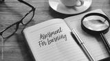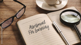 Top-down view of a wooden desk with an open notebook showing "Assessment For Learning," a pen, magnifying glass, glasses, and a cup of coffee.