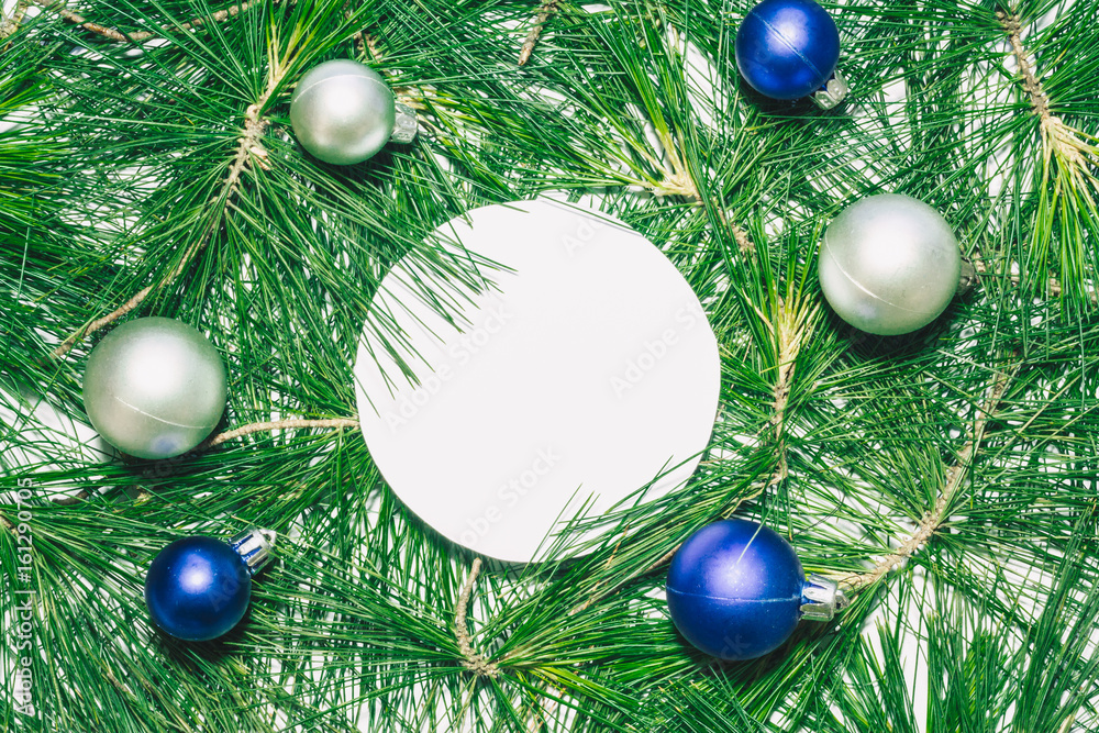 X-mas background with christmas balls and green pine leaves. Round copy space for text