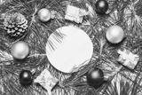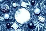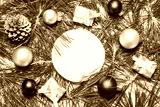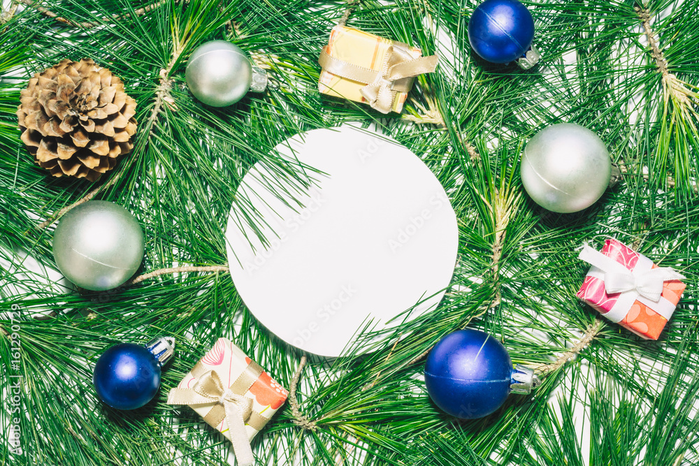 X-mas background with christmas balls, presents, pinecones and green pine leaves. Round copy space for text
