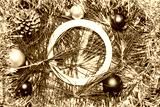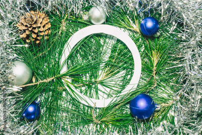 X-mas background with silver decoration, christmas balls, pinecones and green pine leaves. Empty circle copy space for text