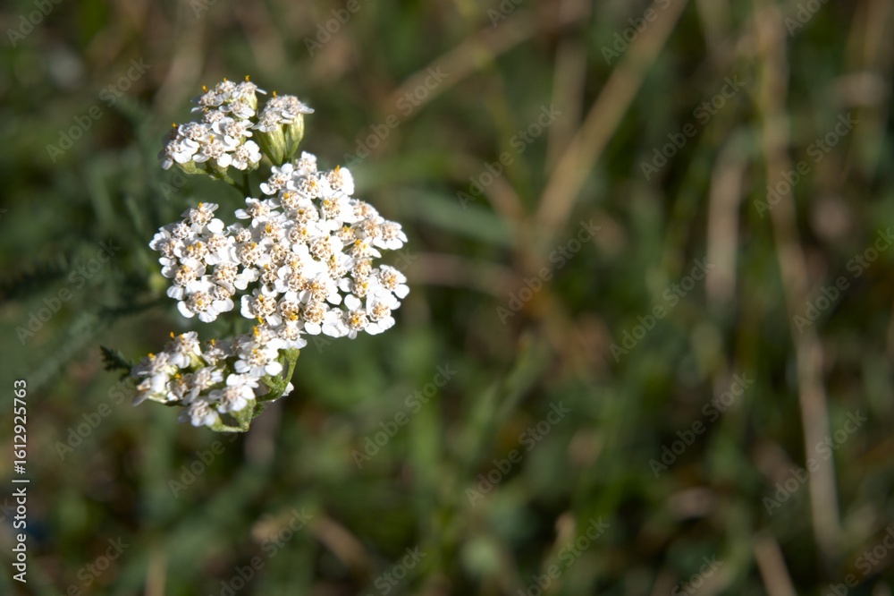 Close-up of a white yarrow flower in bloom during springtime in a meadow with blurred background and natural sunlight