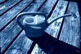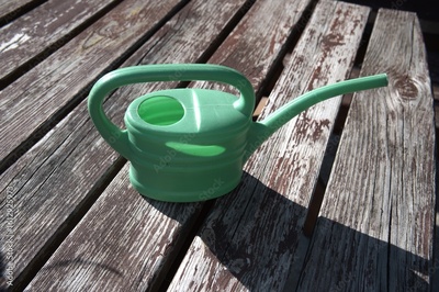 Green plastic watering can on a garden table in sunlight with space for text, natural summer atmosphere