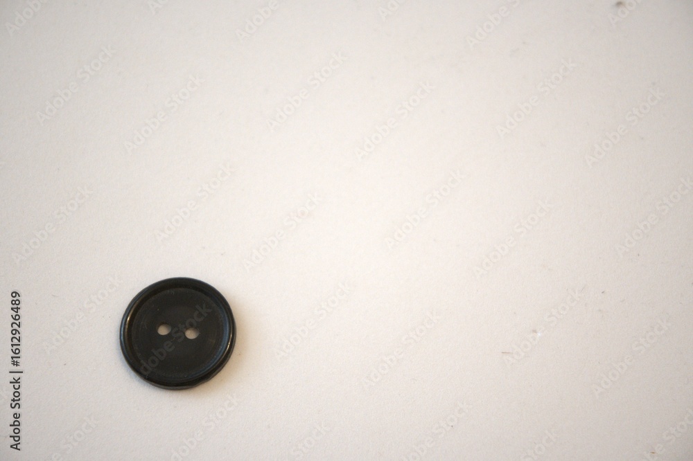 Single black clothing button isolated on white background with copy space, simple textile accessory for garments