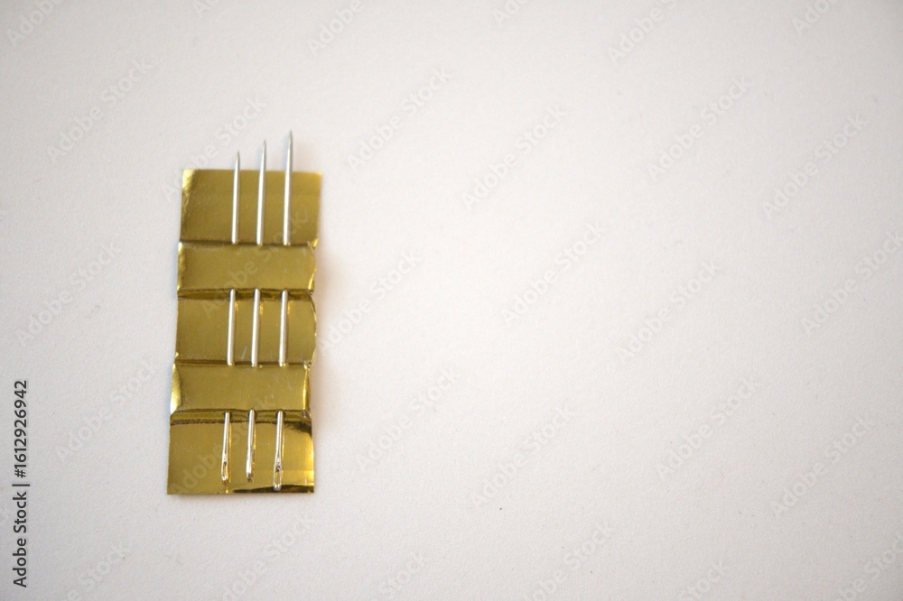 Three sewing needles stuck in gold paper on a white background with copy space, textile craft concept