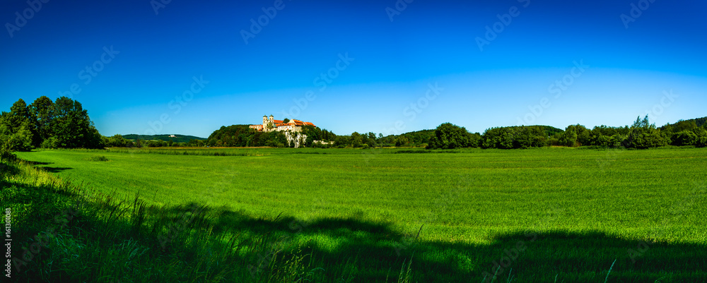 Panorama widoku na Opactwo Benedyktynów w Tyńcu, na pierwszym planie łąka.