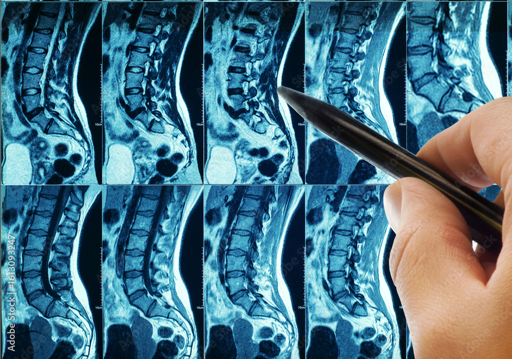 CT of the spine and the doctor's hand. Medicine, science and MRI of the spine. Magnetic resonance imaging. The doctor takes a picture of the spine.
