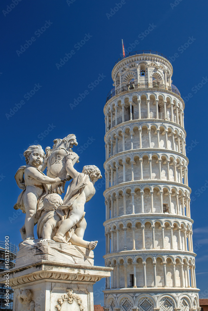 The famous Leaning Tower with statues of angels in the foreground. Pisa, Italy. Clear dark blue sky is in the background.