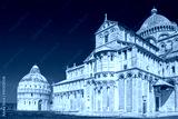 Famous Cathedral and Baptistery in the background in Pisa. Italy. Clear dark blue sky is in the background.