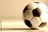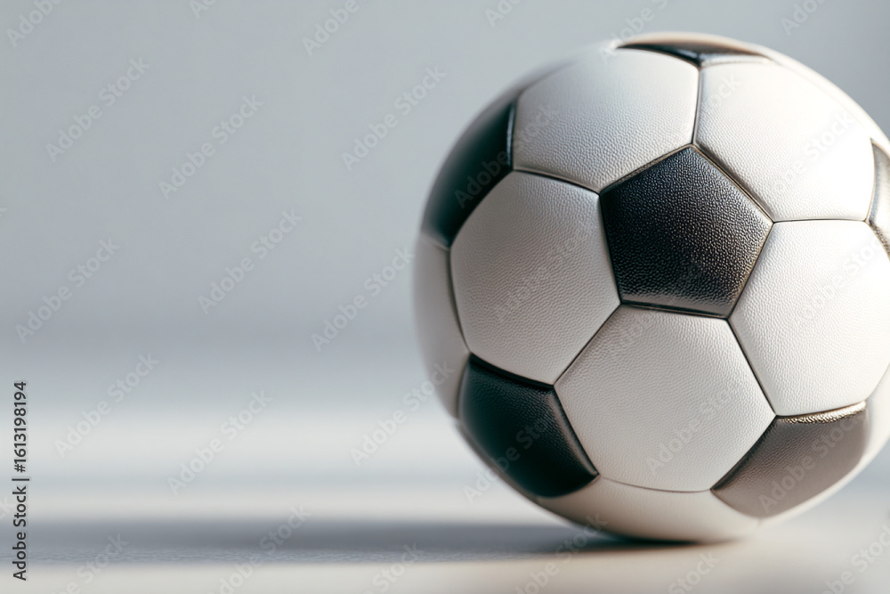 Close-up of a black and white classic soccer ball with pentagonal and hexagonal panels.