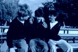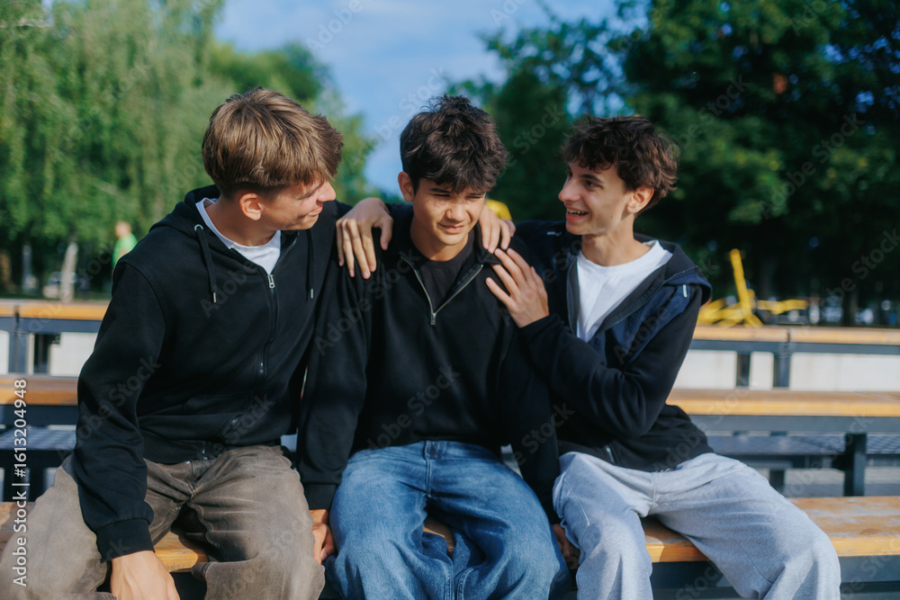 Candid teen boys bonding and talking outdoors on school bleachers
