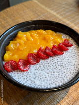 Chia seeds with coconut milk and fresh berries breakfast bowl. UGC cafe picture with healthy meal, close up no people