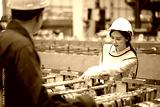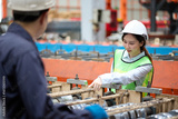 Engineer or worker talking and meeting with coworker in the metal sheet factory