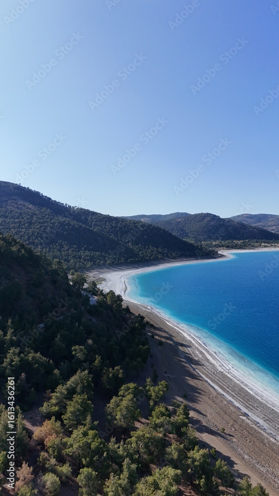 Blue lake scenery. River, trees, sky. Lake in Turkey High quality photo