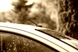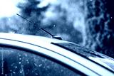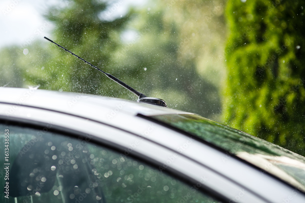 Heavy summer rain pours down on the roof of the car