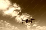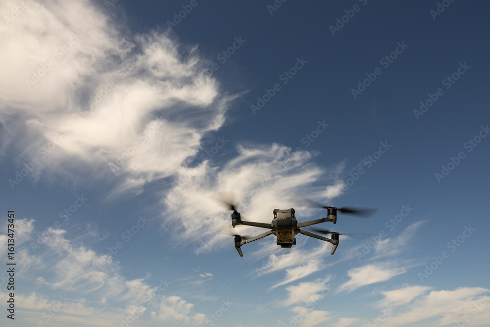 A drone with a camera, a drone flying against the background of a blue sky, an unmanned flying object, a drone hovering in the air.