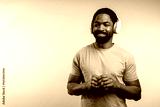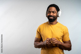Handsome African American man listening to music with wireless headphones, isolated studio portrait, calm expression