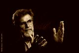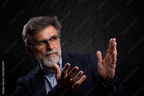 Mature handsome man smiling with outstretched hands toward camera, black background, chiaroscuro lighting, positive mood