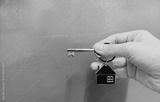 Hand holding a silver key with house shape keychain. Housing and property investment concept. House key.
