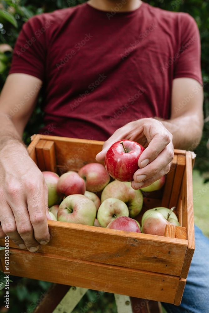 Man holds red apple above wooden crate filled with green and red apples during harvest in a lush garden