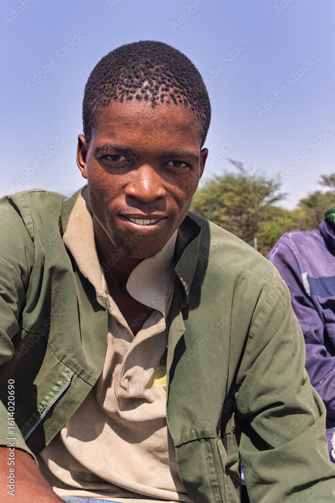 africa village, portrait head and shoulders of young african man profile view , outdoors against the blue sky
