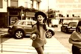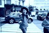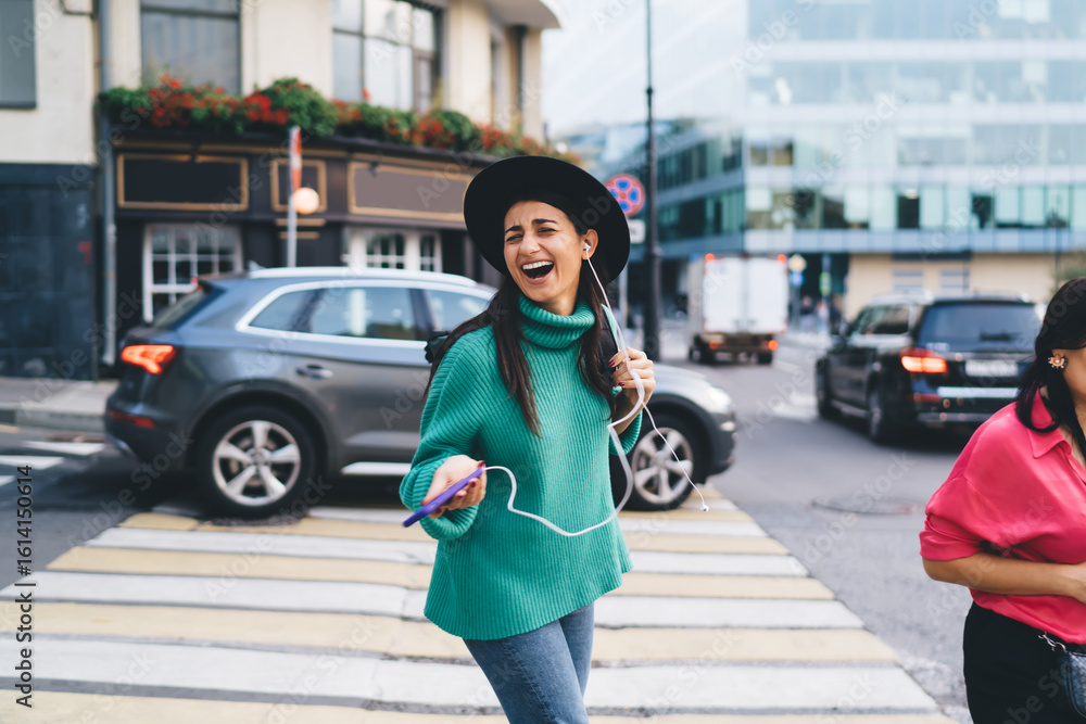 Brunette woman, 30, laughs while listening to music through smartphone and earphones, expressing carefree joy and freedom through digital streaming in motion.