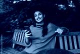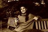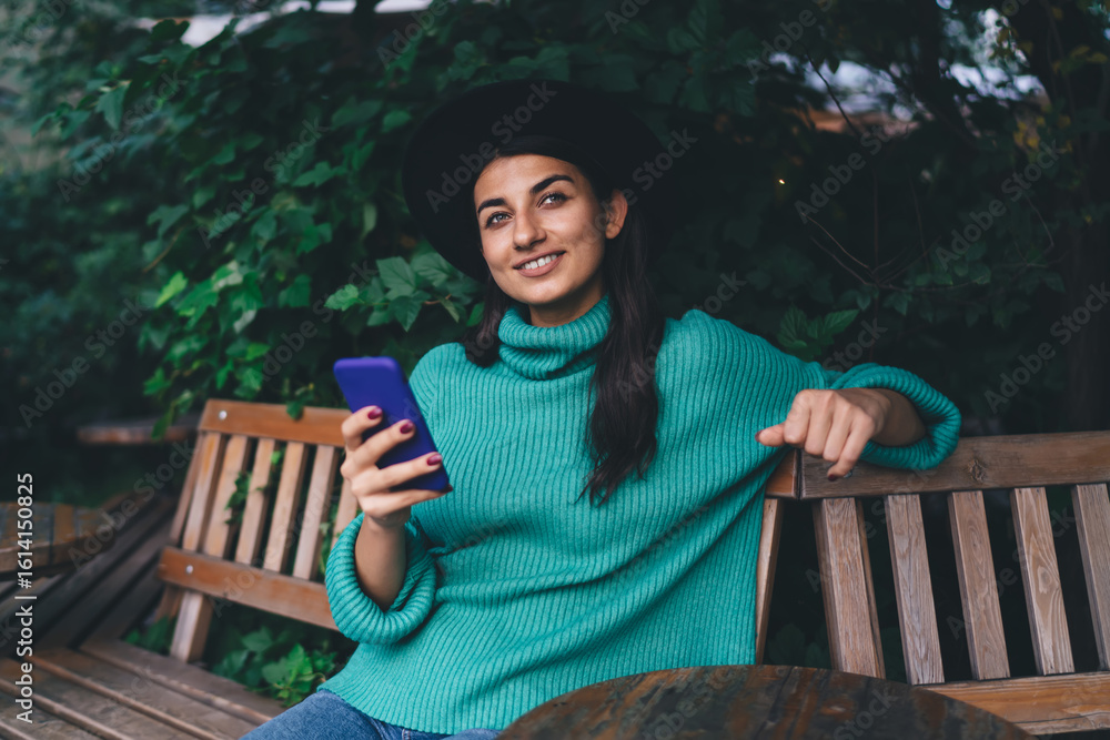Young woman, 30, sitting on bench, smiling while holding smartphone, enjoying moment of digital connection and reflecting on personal tech's impact on everyday communication.