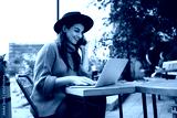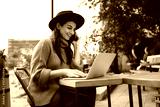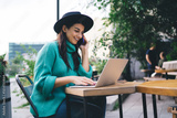 Smiling woman, 30, holds smartphone to ear while using laptop at outdoor table, showing active communication and coordination in flexible mobile work routine.