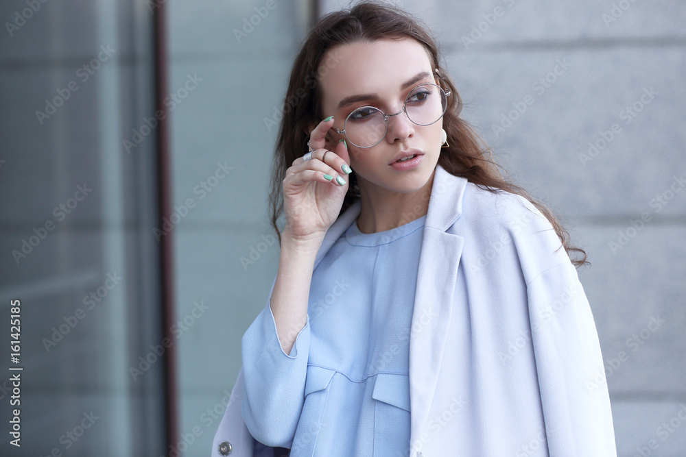 fashion portrait of young elegant woman outdoor in jacket, dress, glasses