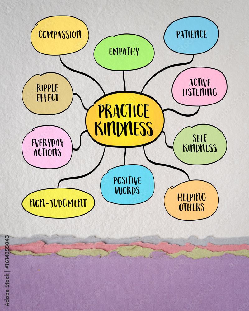 Practice kindness concept. Kindness is often mistaken for weakness - but in truth, it takes strength, intention, and courage to be kind. Infographics mind map.