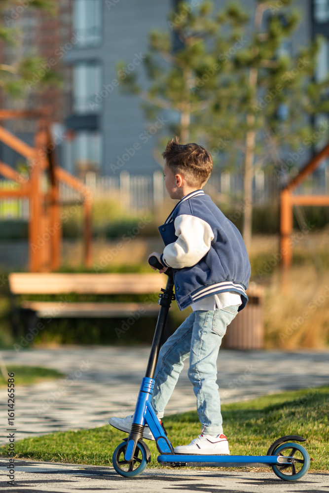 Rear view child little boy riding scooter on the sidewalk in a city park. Active outdoor fun for kids. Summer sports for preschool children. High quality photo