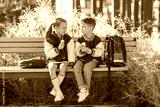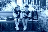 Two happy laughing sibling children with backpacks, little boy and girl sitting an a wooden bench in the park, eating cold ice cream after school lessons. Concept of friendship and family relationship