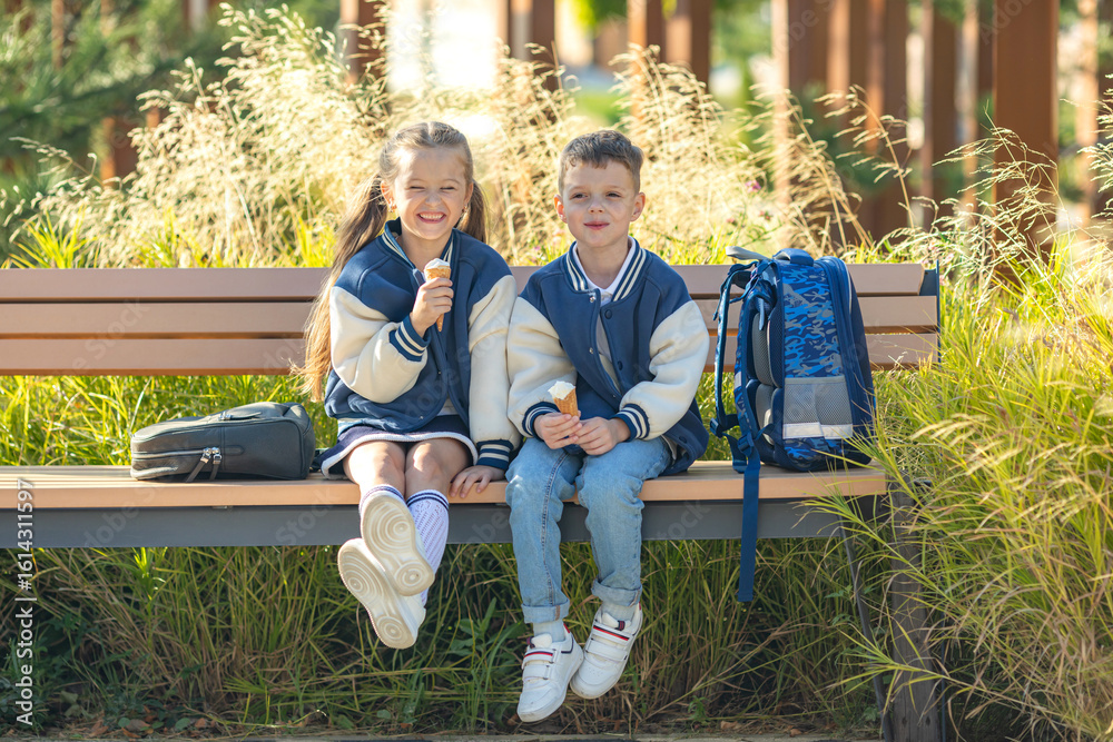Two happy laughing sibling children with backpacks, little boy and girl sitting an a wooden bench in the park, eating cold ice cream after school lessons. Concept of friendship and family relationship