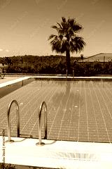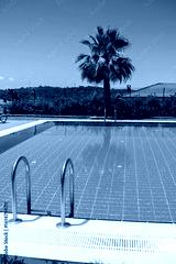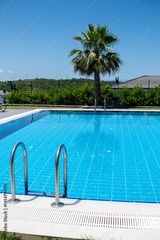 Bright Summer Day at a Serene Swimming Pool Surrounded by Lush Greenery and a Single Palm Tree