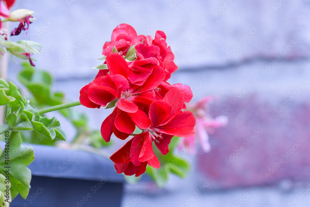 Vibrant red geraniums bloom against a textured wall in a sunny outdoor setting during springtime