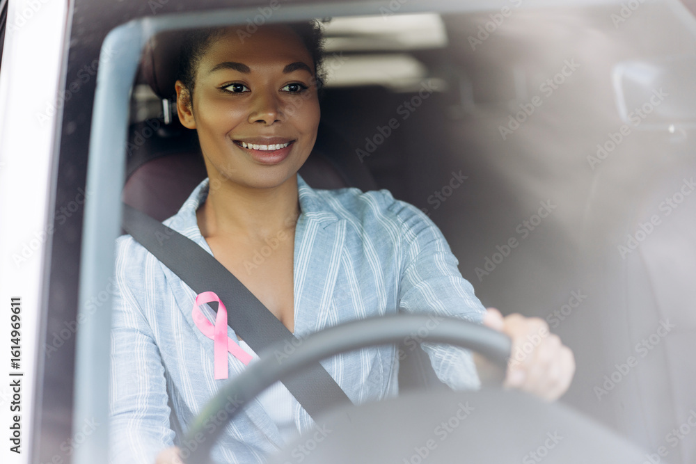 Smiling African American woman with pink ribbon for breast cancer awareness in her car