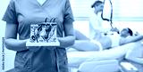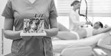 Cosmetologist explains structure hair on skin using skin anatomy model while another professional performs laser hair removal for patient using modern laser