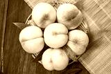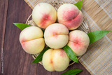 White Peaches with leaves on the wooden table, Fresh White Peach on wooden basket in wooden Background.
