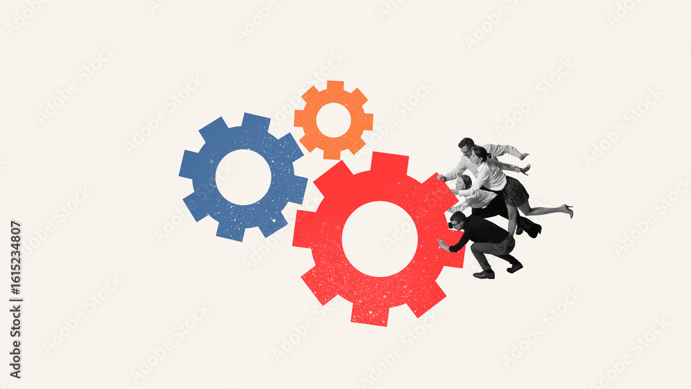 Collage of business people pushing colorful gears in teamwork. Concept of collaboration, teamwork, SaaS platforms, workflow coordination, and digital transformation.